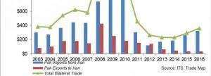 Pakistan’s top export in 2016 included $19 million worth of paper and paperboard while rice exports fell to $8.3 million due to the sanctions placed in 2011. On the other hand, Iran’s rice imports from the world stood at $517 million, 97% of which were from India, since India circumvented the sanctions by using a barter model of trade that would not suit Pakistan.